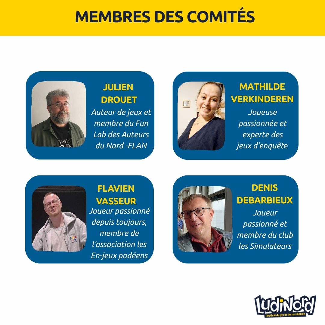 Leur tâche sera, à l'issue des délibérations, de déterminer une liste entre 3 à 5 jeux dans la catégorie Enfant et entre 8 et 12 jeux dans chaque catégories Famille et Stratégie, lesquels seront présentés au public et en compétition lors de l’édition 2026 de LudiNord !
